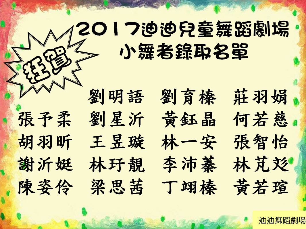 2017年 迪迪兒童舞蹈劇場 小舞者 錄取名單